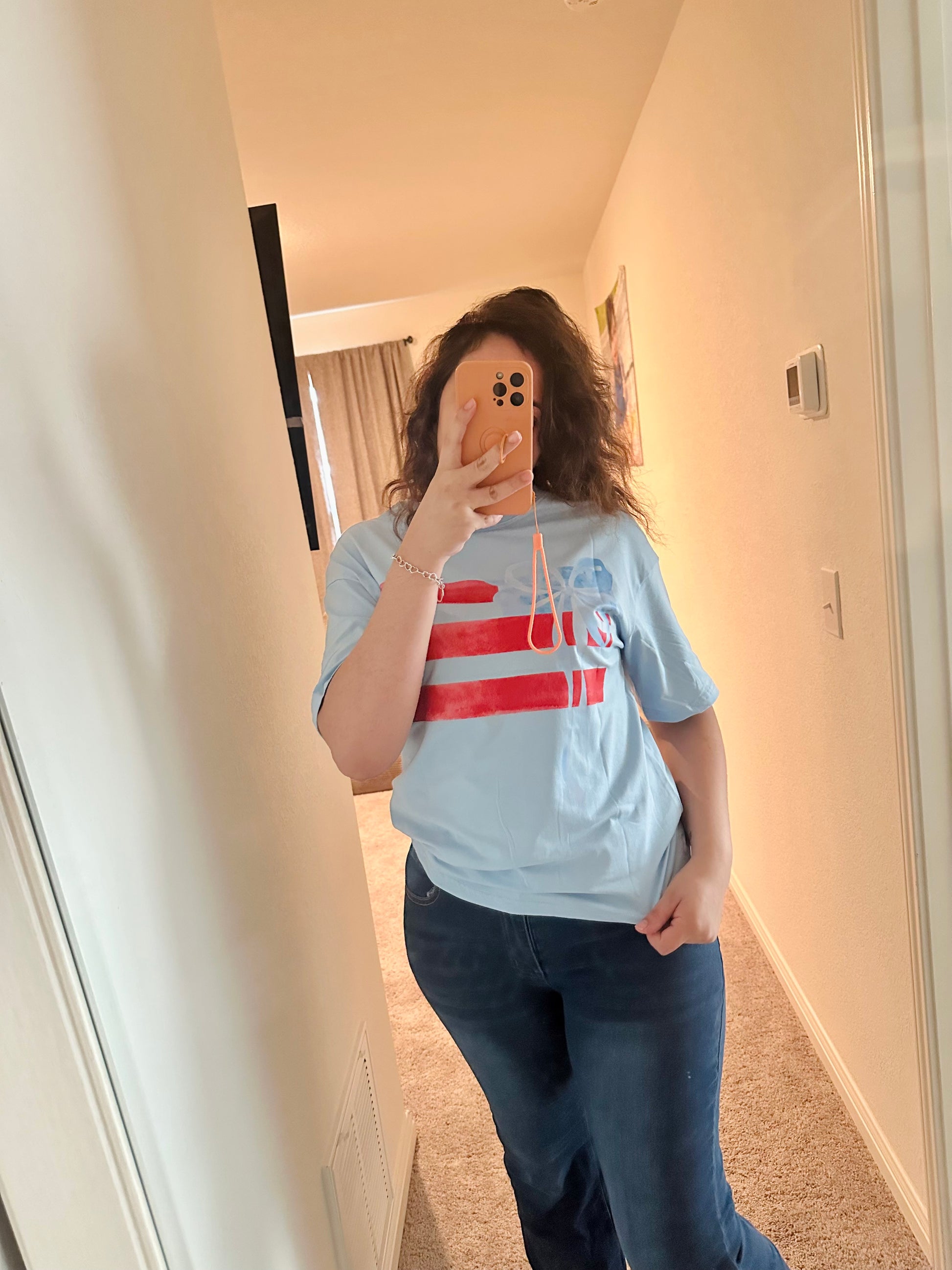 This premium Myosotis Flag Bow Graphic Crewneck Tee features a sophisticated American flag and bow design, expertly printed on high-quality fabric. The classic crewneck silhouette offers versatile styling options while maintaining comfort for all-day wear. Perfect for patriotic celebrations or as a stylish statement piece in your casual wardrobe rotation.