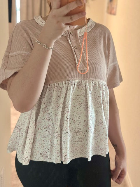Pink Waffle Floral Patchwork Exposed Seam Detail Short Sleeve Top
